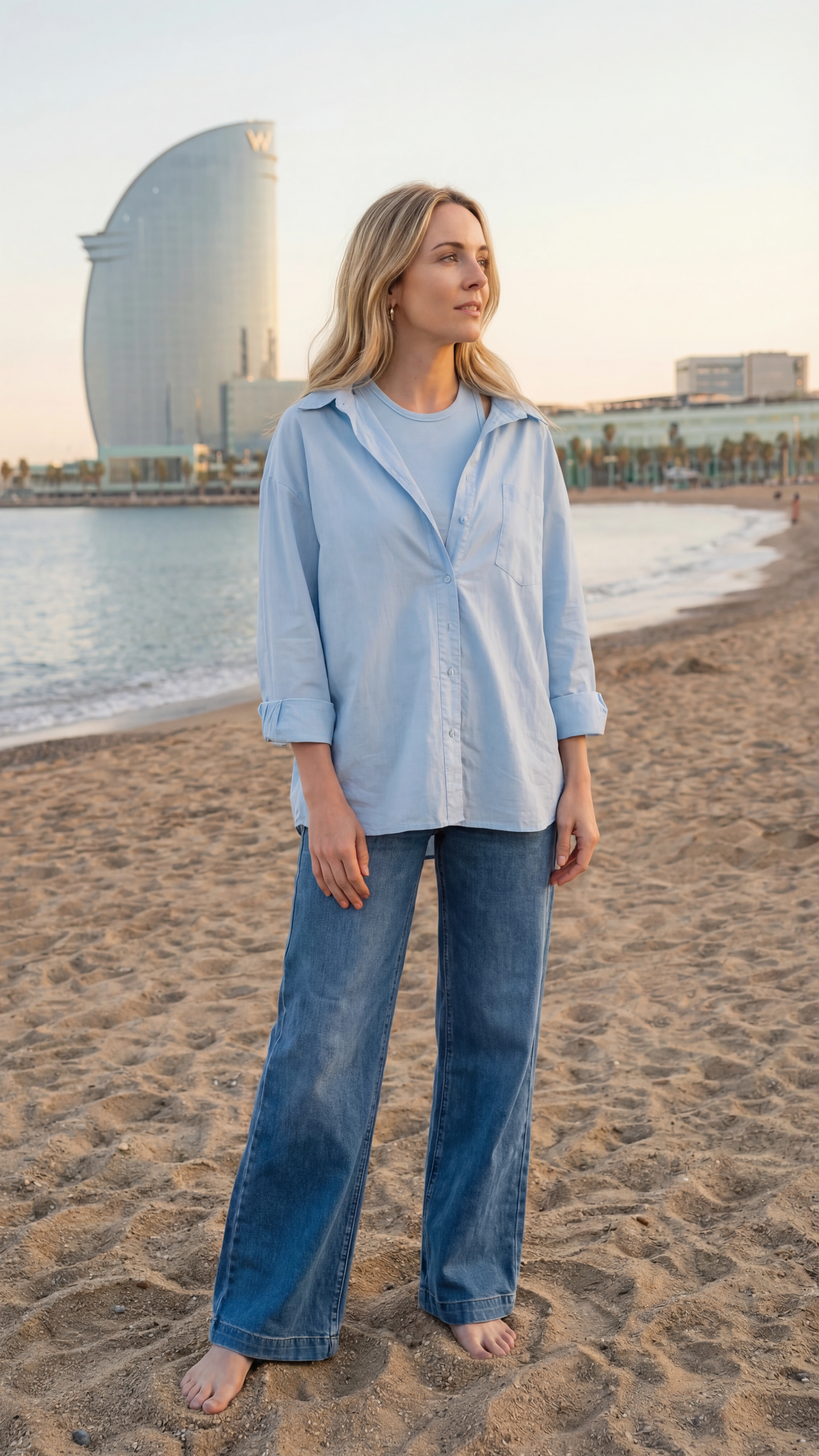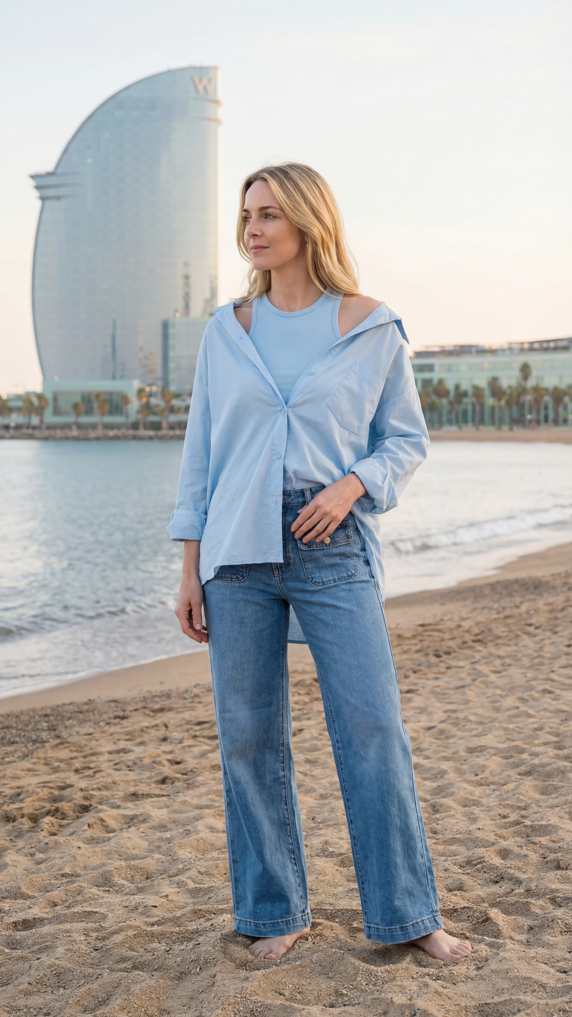 Camisa color azul celeste con cuello de camiseta de tirantes interior incorporado. 100% algodón. Talla única (de la 38 a la 44).