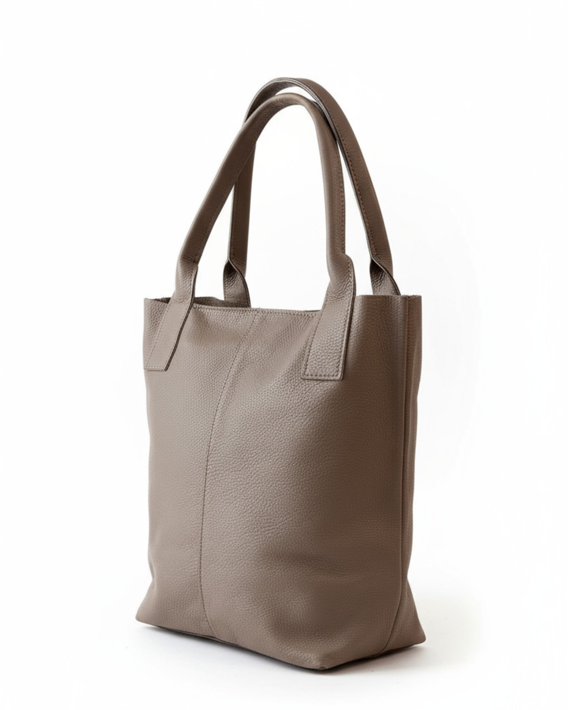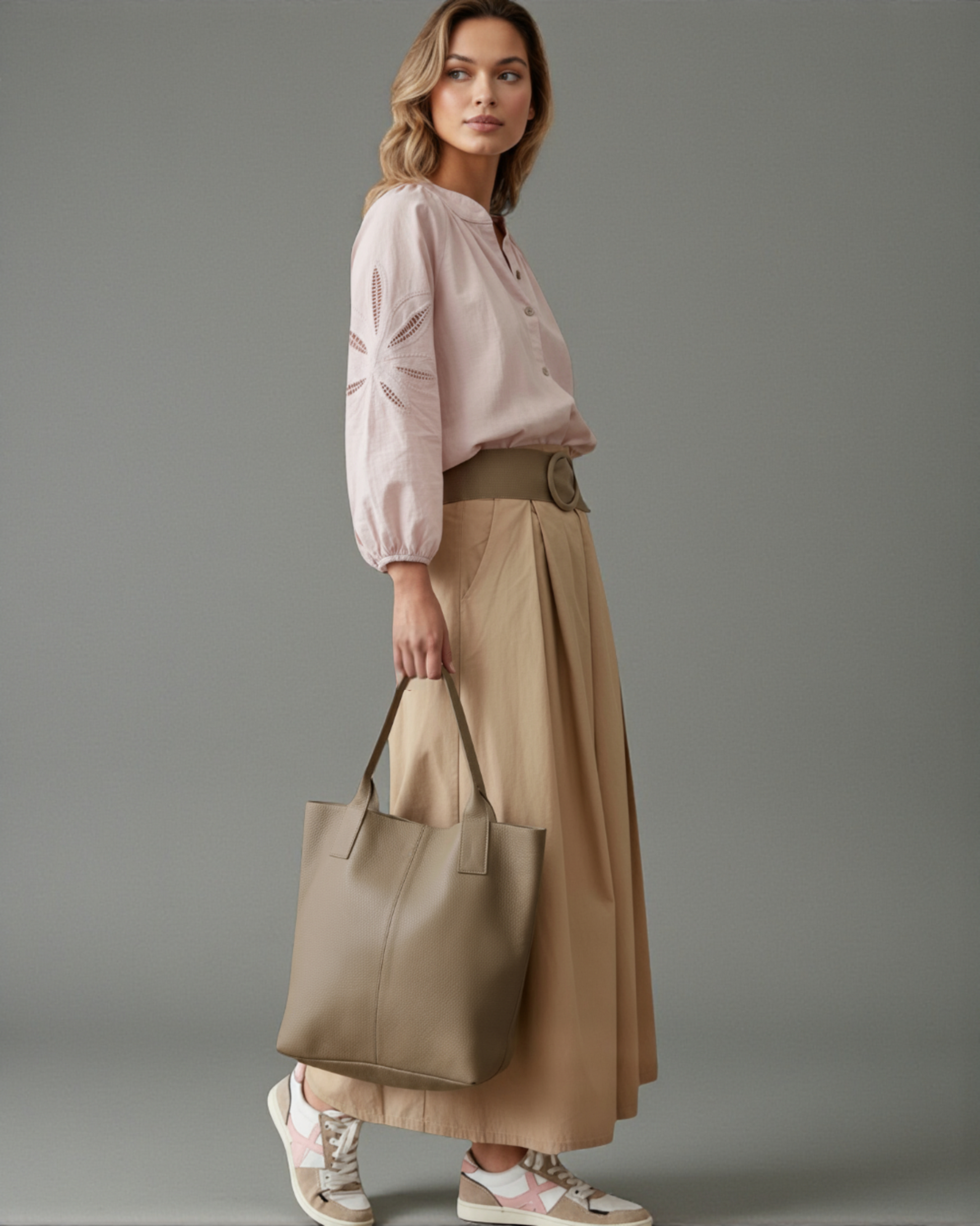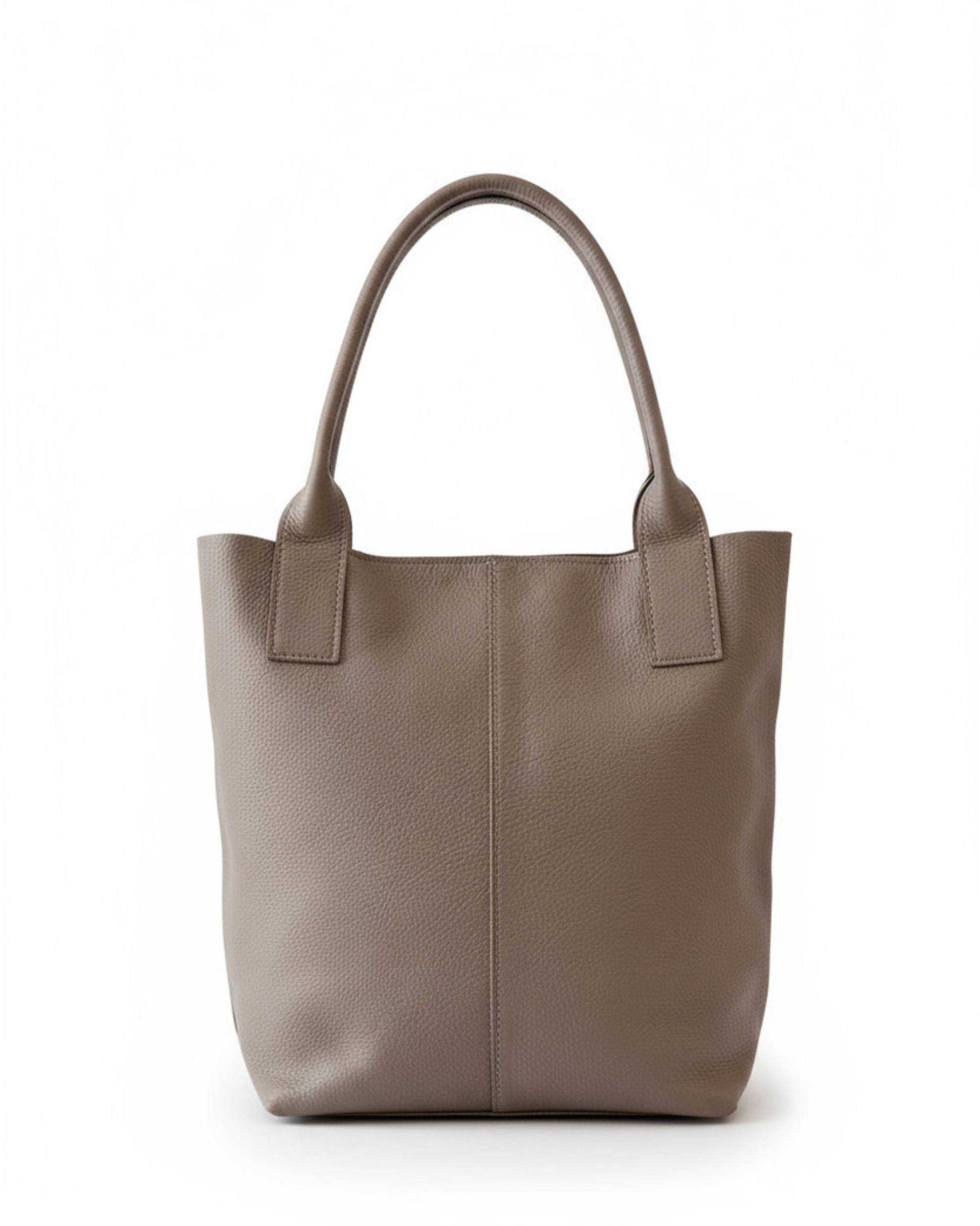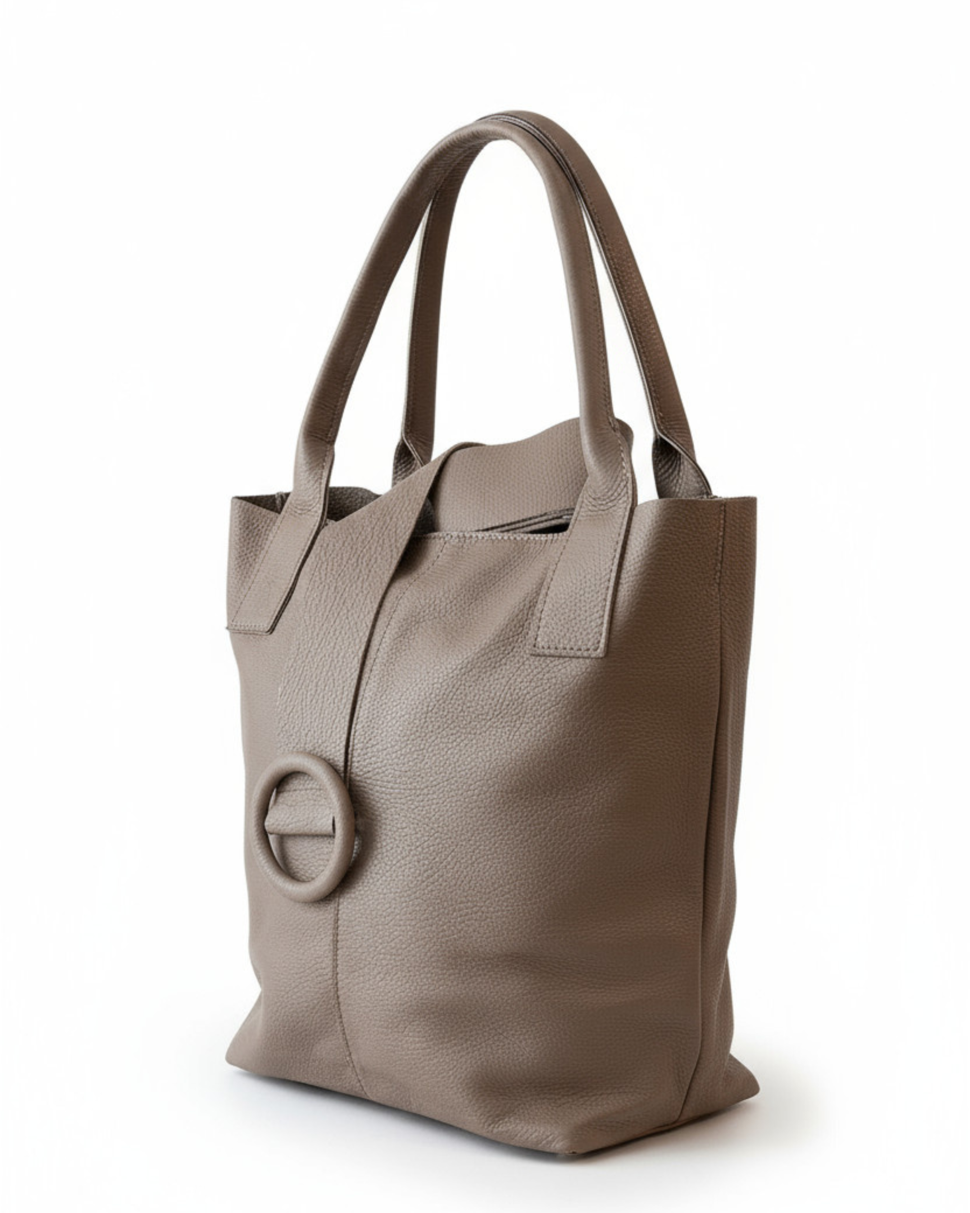 Este bolso y cinturón están hechos de piel italiana de alta calidad, con un acabado suave y textura ligeramente granulada que realza su elegancia y resistencia. El bolso, tipo tote, es espacioso y versátil, ideal para el día a día por su diseño minimalista y líneas limpias que lo hacen muy fácil de combinar con cualquier look. El cinturón a juego, con hebilla circular forrada en piel, aporta un toque moderno y sofisticado, siendo perfecto para marcar la cintura y sumar estilo extra a tus conjuntos.