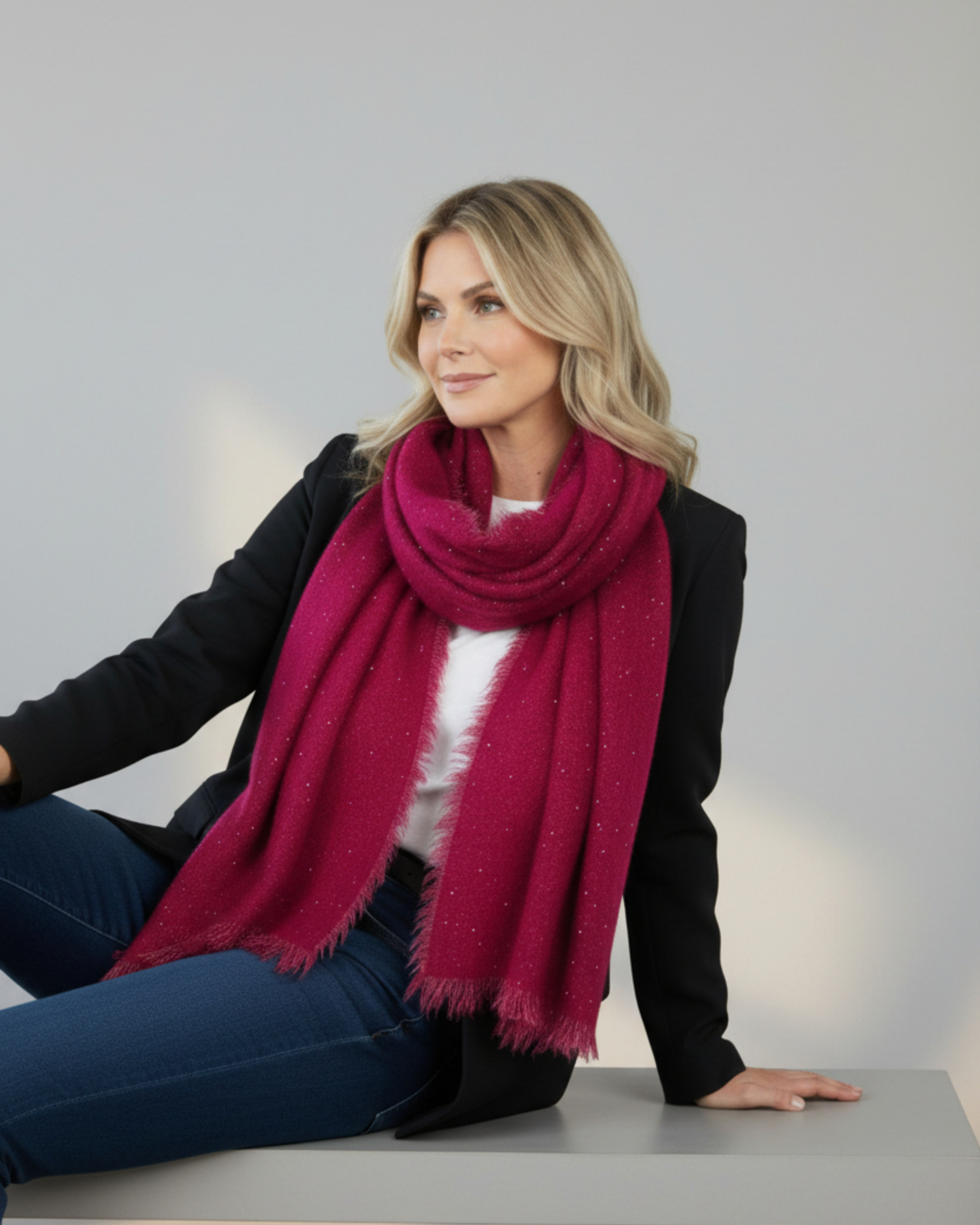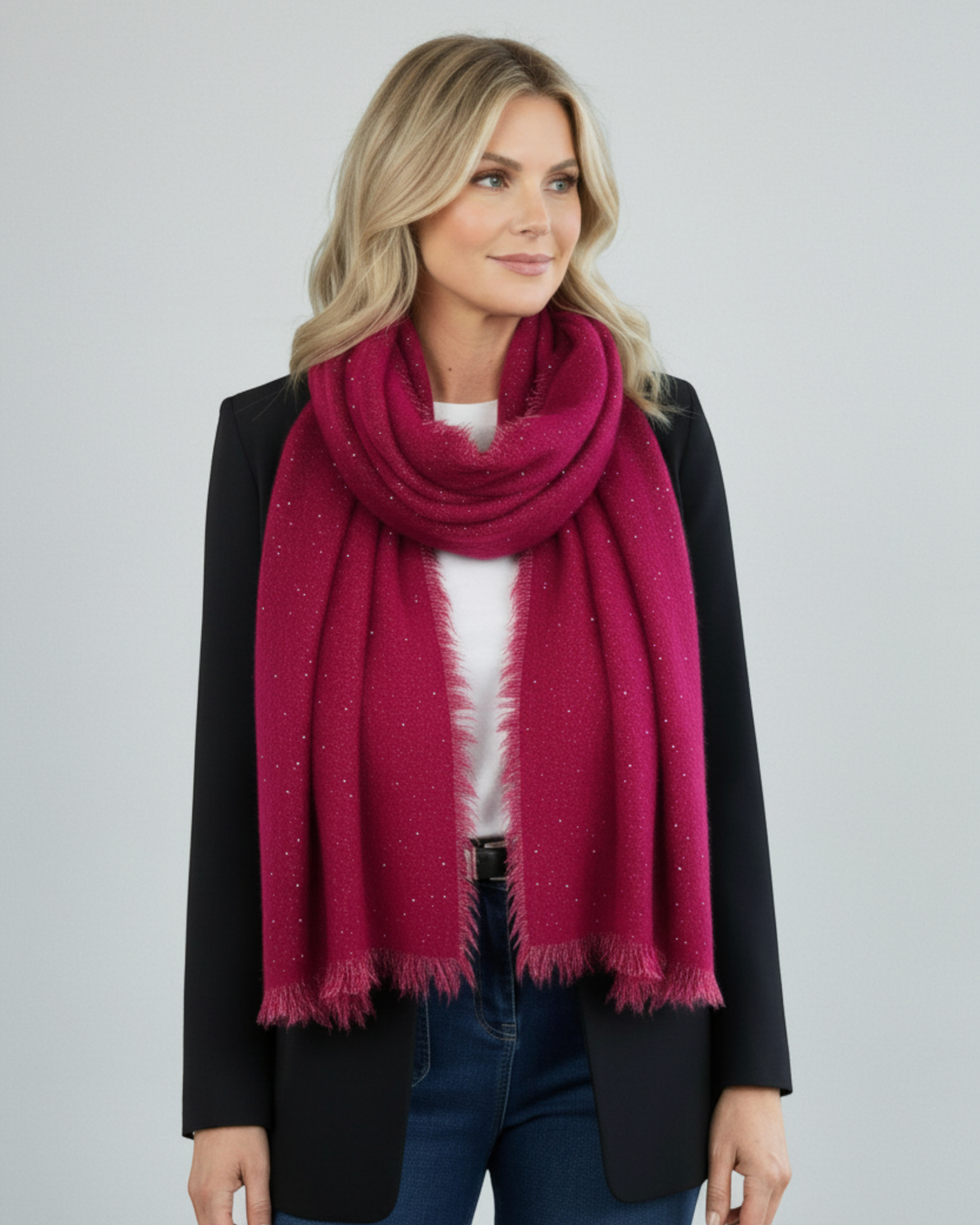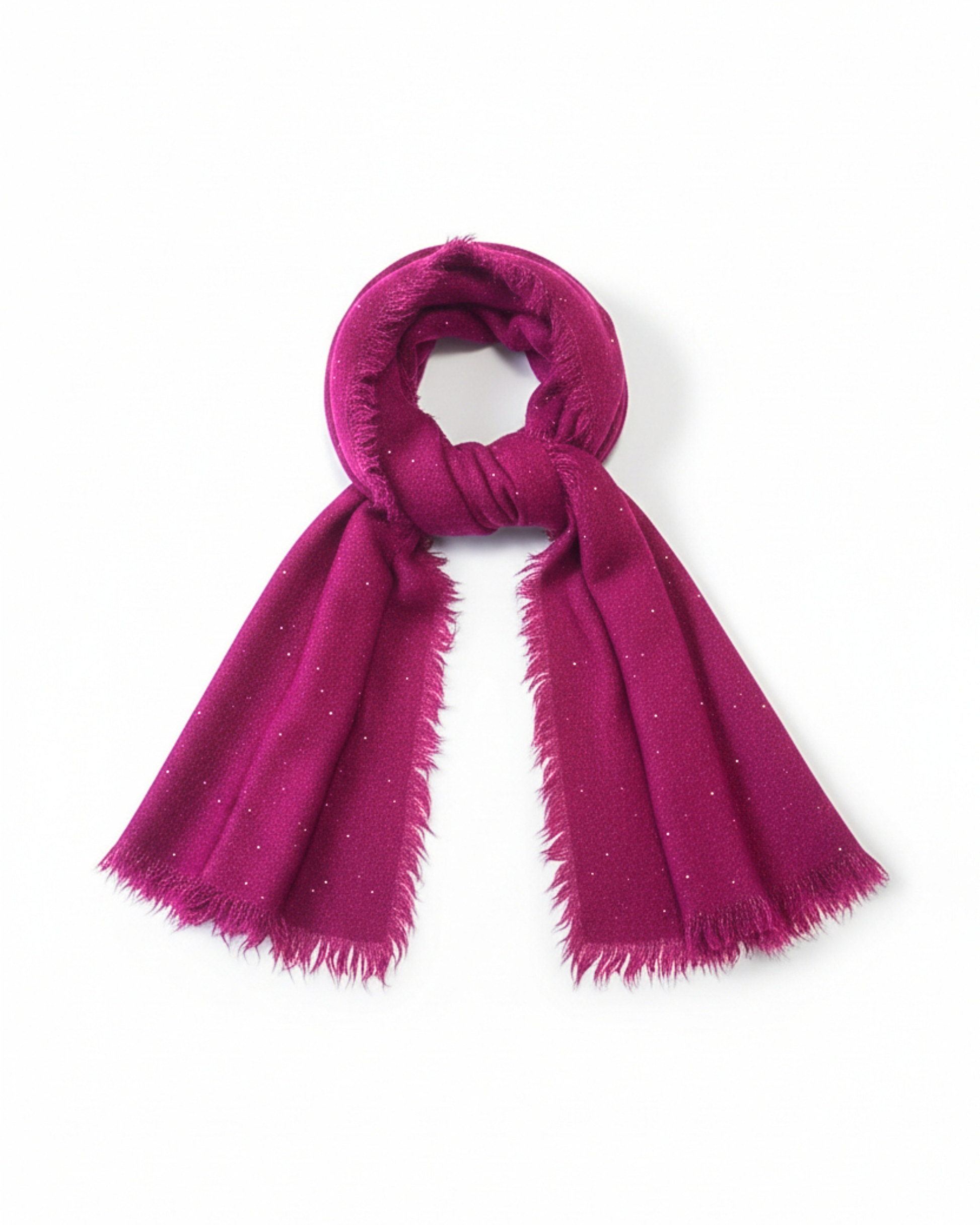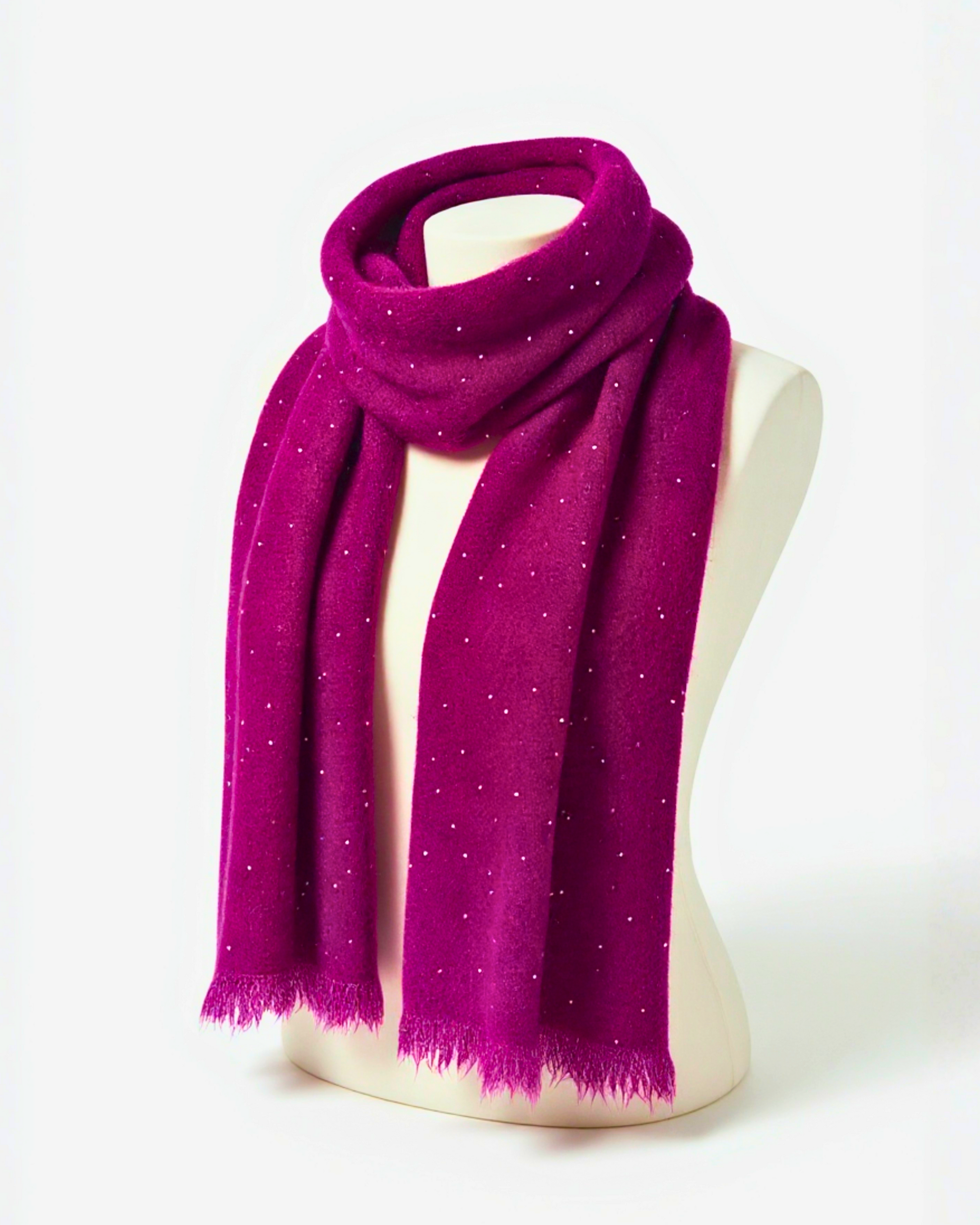 Esta bufanda destaca por su sofisticada combinación de materiales: compuesta por un 30% de lana y un 70% de viscosa, ofrece una textura suave y cálida que resulta ligera y agradable al tacto. El acabado en color fucsia vibrante se ve realzado por pequeños destellos, aportando un estilo elegante y moderno.