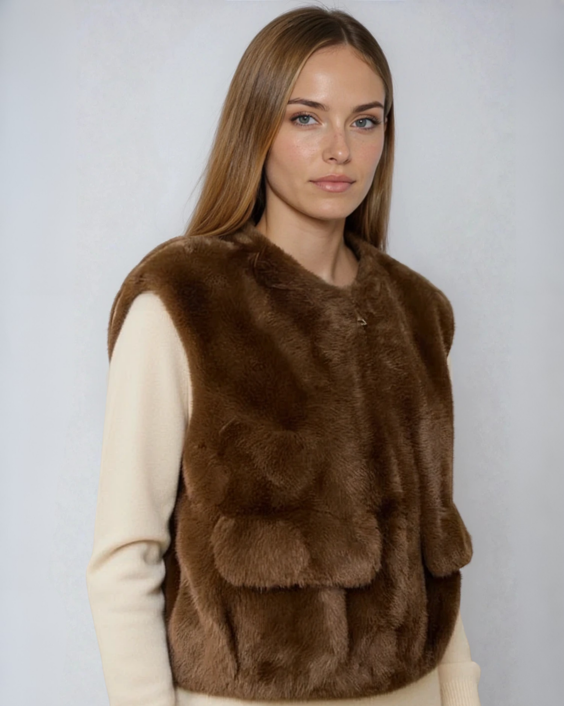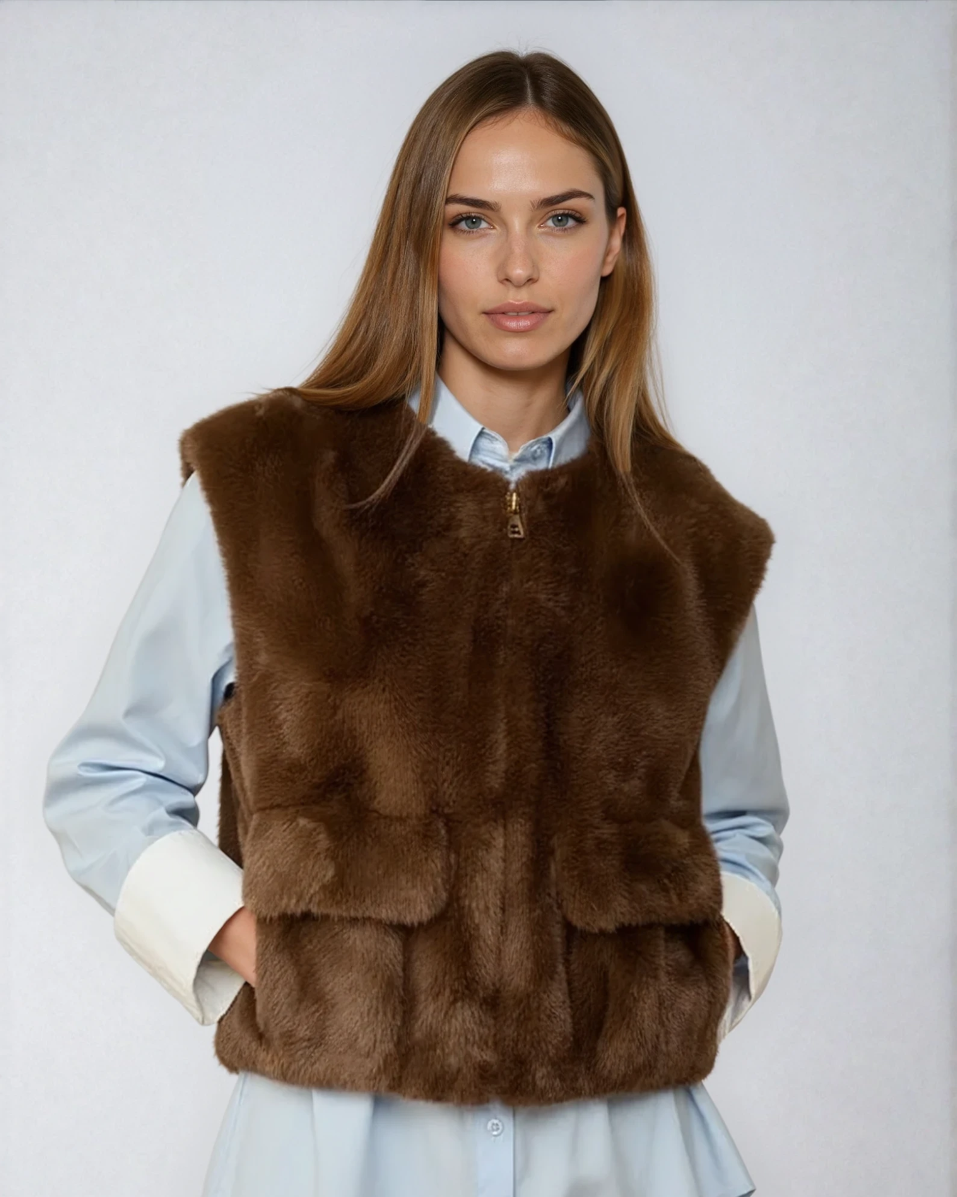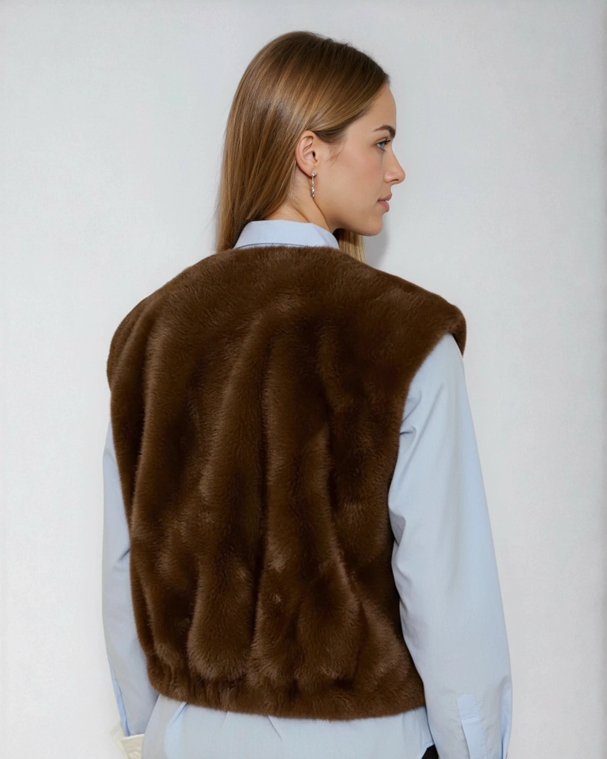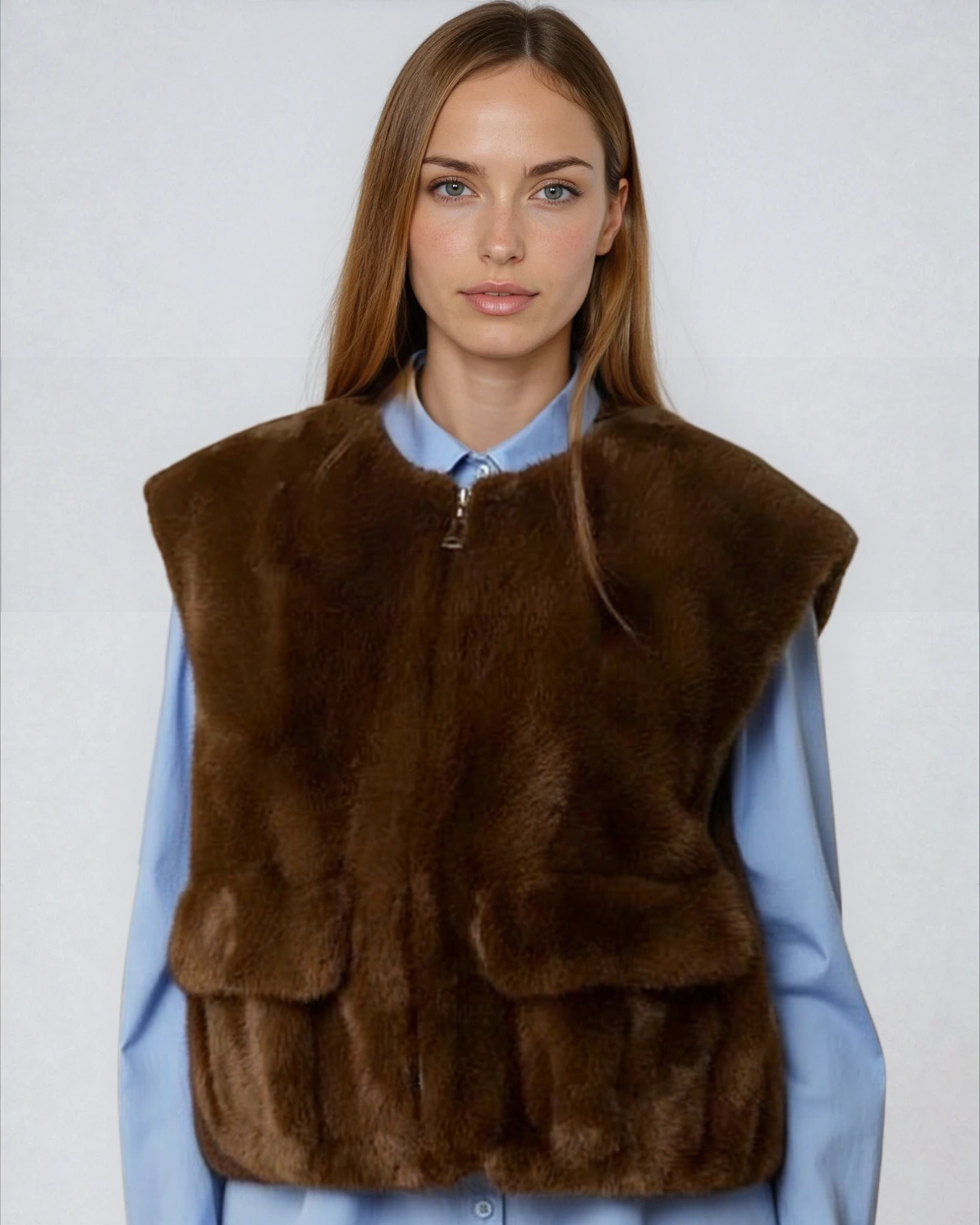 Chaleco de pelo sintético en color marrón chocolate, diseñado con acabado suave y voluminoso para un look cálido y sofisticado. Cuenta con cierre de cremallera metálica al frente y bolsillos delanteros de tipo parche, perfectos para aportar estilo y funcionalidad. Su corte recto y relajado lo hace ideal para combinar sobre camisas, jerséis o vestidos, añadiendo textura y elegancia a tus conjuntos en los días fríos. Una opción cómoda y moderna que apuesta por una moda sostenible y versátil.
