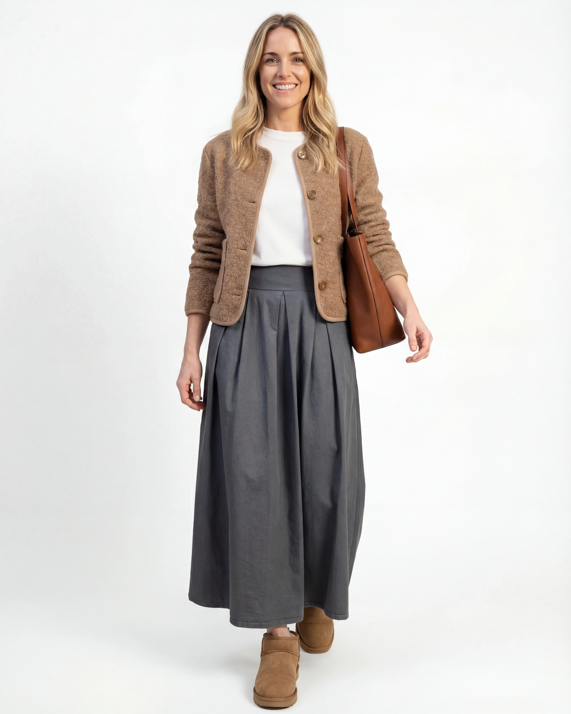 Tejido boucle suave y voluminoso en beige terroso. Manga larga, cierre frontal abotonado, sin forro interior. Perfecta sobre camisas blancas, jeans, faldas o botas altas para estilismos versátiles.