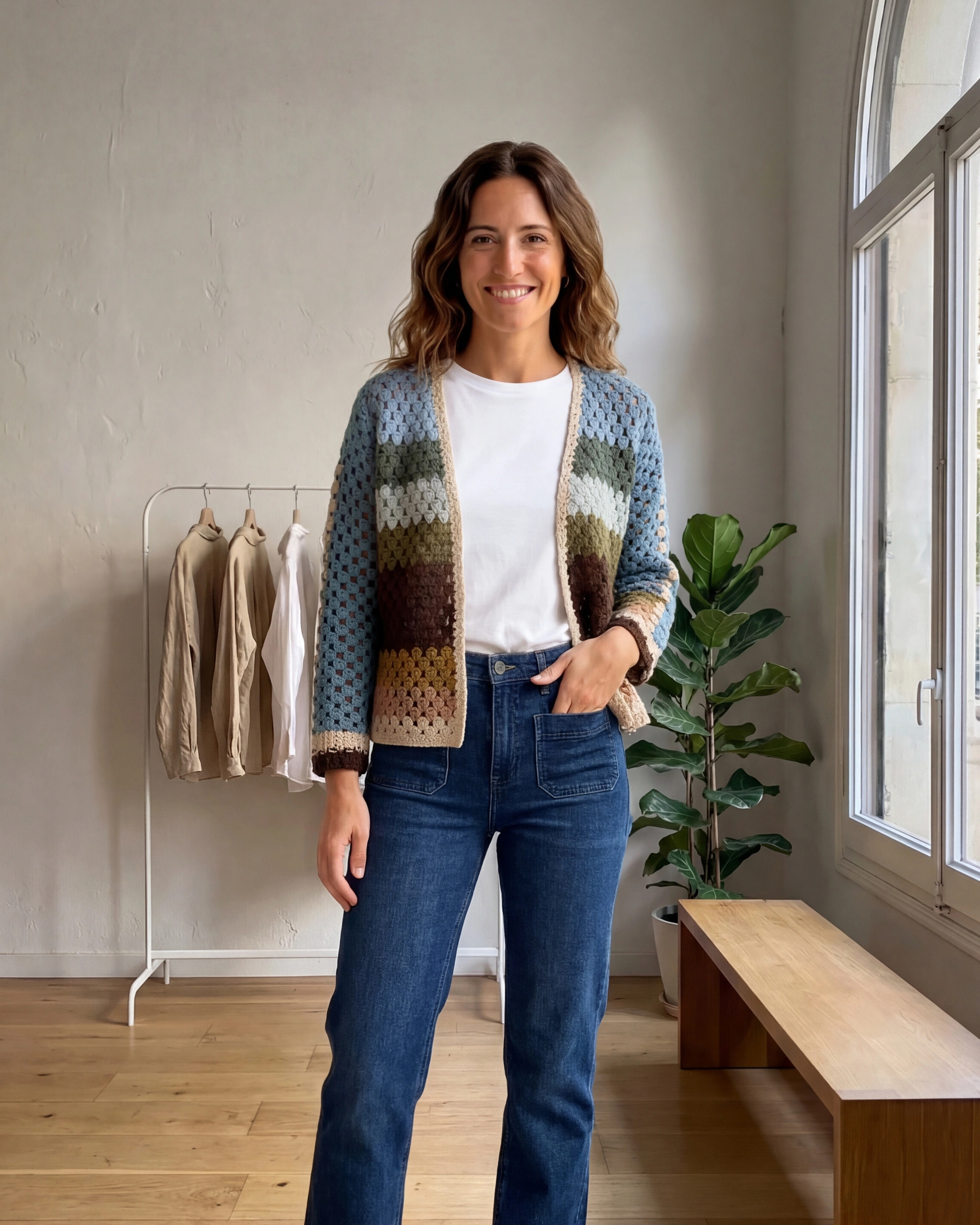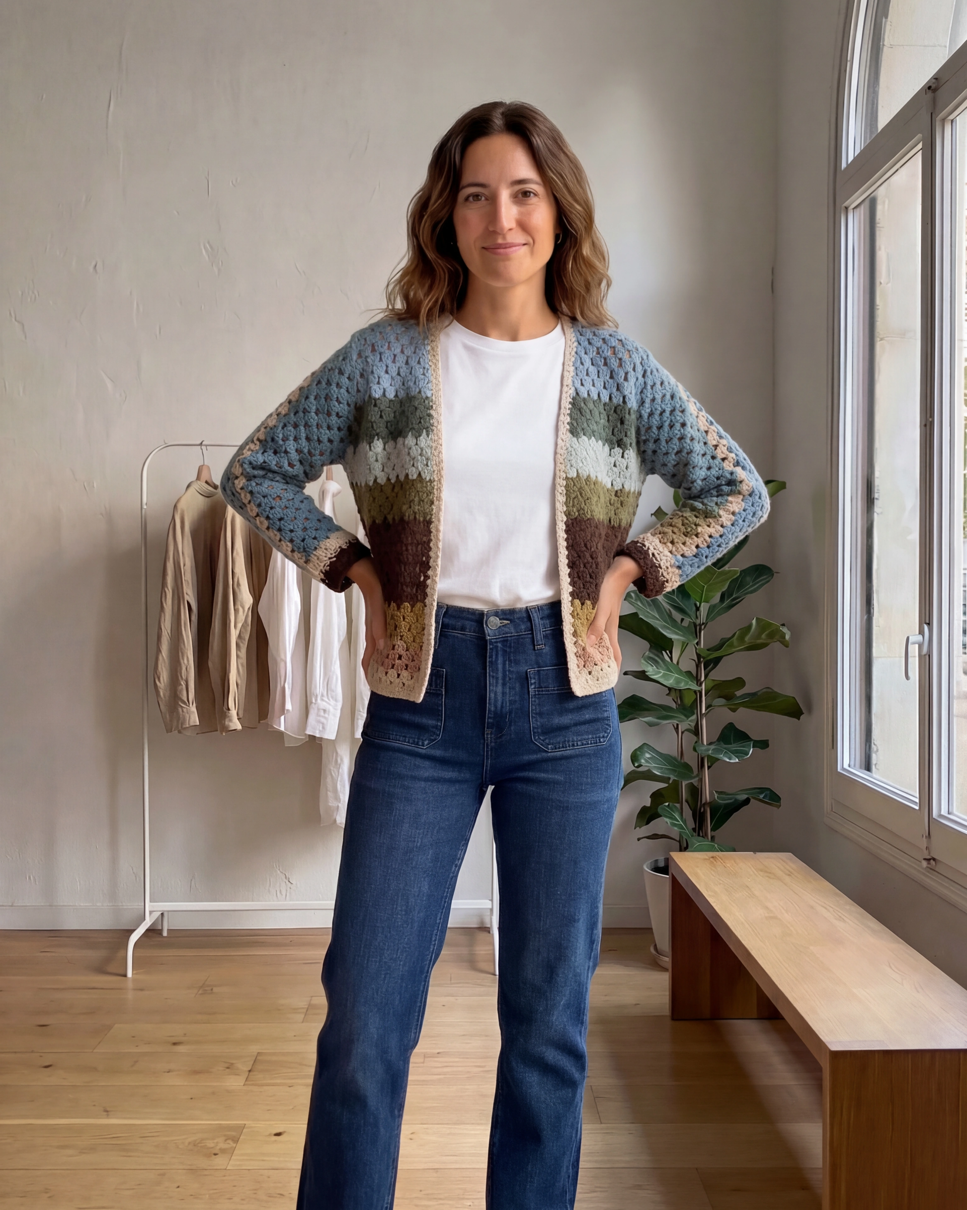 Chaqueta corta de croché multicolor, tejida a mano con motivo de grannys en franjas horizontales. Combina tonos azul cielo, verde oliva, mostaza, marrón chocolate, beige y crudo, con remates en ribete beige claro. Silueta recta y ligeramente suelta, sin cierres, perfecta para llevar abierta sobre camisetas básicas. Manga larga y hombro relajado, de largo hasta la cadera, ideal para looks casual con vaquero.