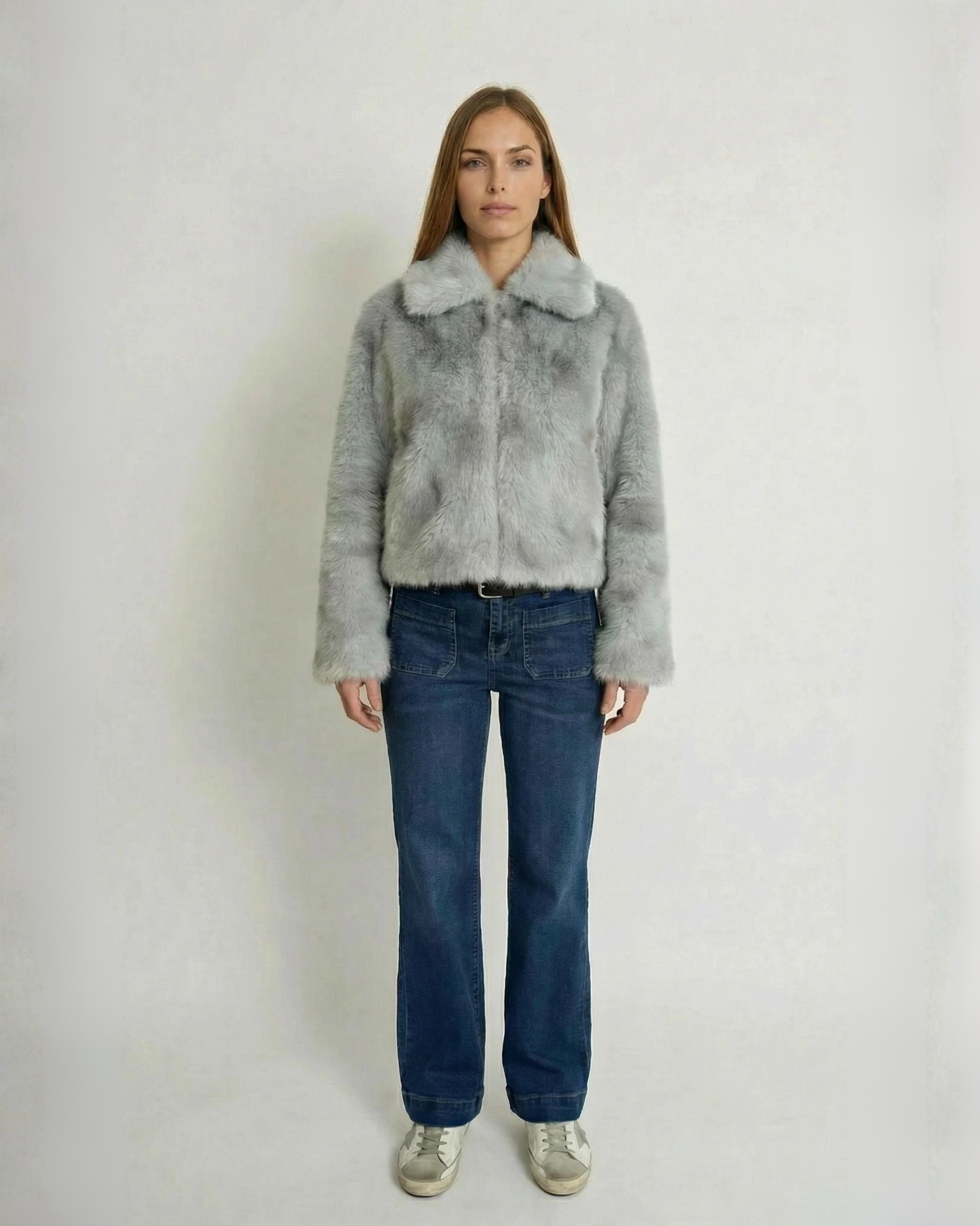 Chaqueta corta de mujer confeccionada en piel sintética de efecto visón, con acabado ultra suave y cálido. Esta pieza de abrigo, en tono gris hielo, destaca por su estructura de corte recto, cuello clásico y cierre delantero de cremallera invisible, logrando un look elegante y atemporal para invierno y entretiempo.