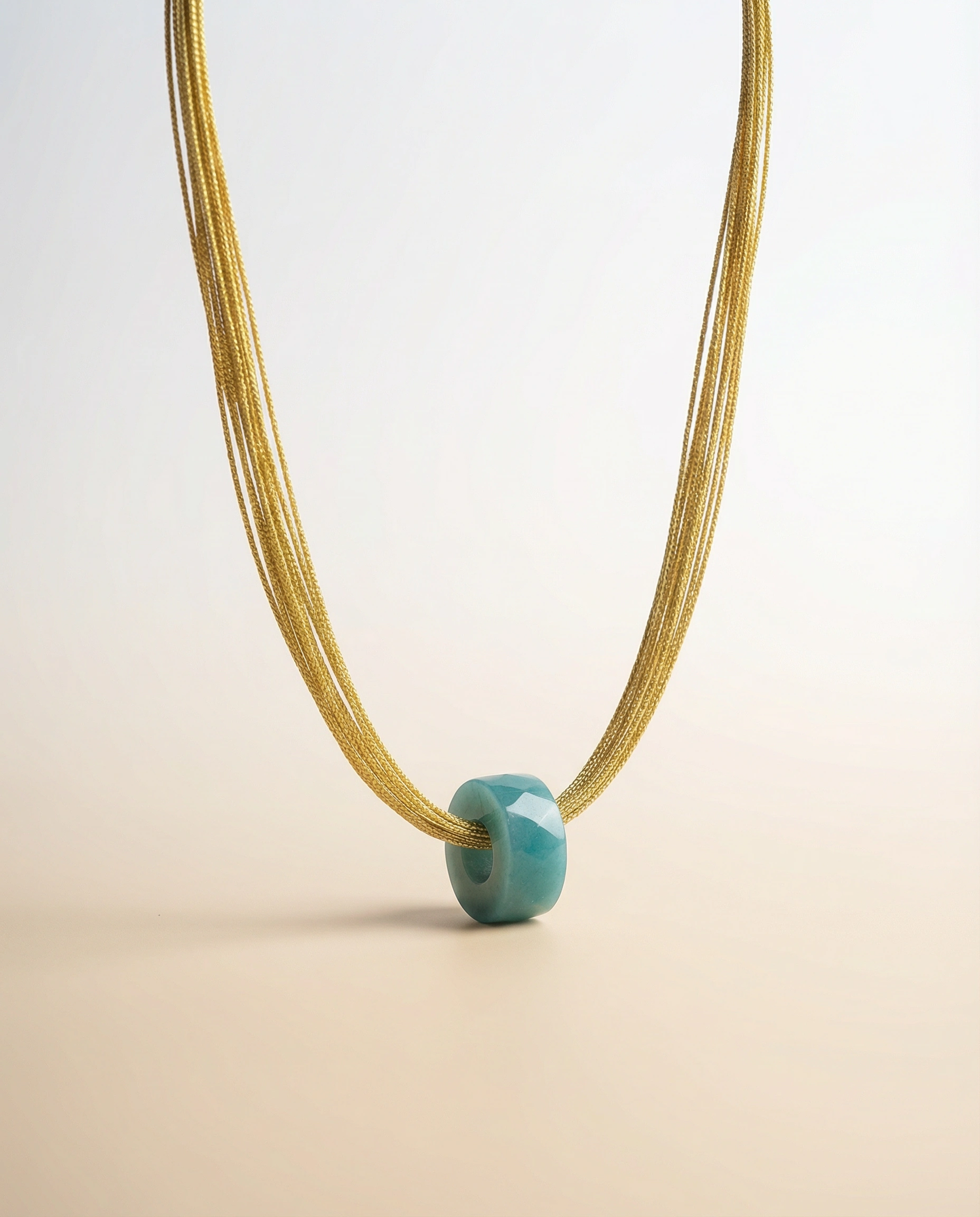 Collar artesanal de múltiples cordones finos en tono dorado cálido con bead central de jade pulido glossy que captura la luz de forma única. Diseño boho elegante perfecto para elevar looks diarios o outfits especiales, con caída natural que se adapta al cuello.