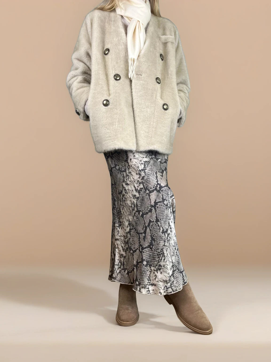 - Chaquetón de pelo sintético efecto realista sin solapas y de abotonadura cruzada. 100% poliéster. Talla única.