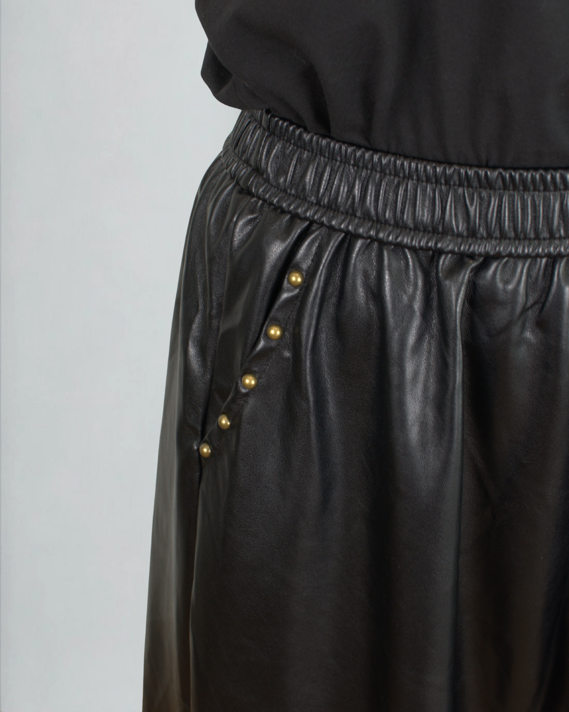 Falda larga de piel vegana en color negro, diseñada con cintura elástica fruncida para un ajuste cómodo y moderno. Su silueta amplia y fluida aporta movimiento y sofisticación, ideal para crear looks elegantes o informales según el estilo y los complementos elegidos. El material imita a la perfección la textura del cuero real, pero es 100% libre de origen animal, convirtiéndose en una opción sostenible y actual para cualquier armario. Perfecta para combinar con camisetas básicas y zapatillas para un look urbano o con tops y botines para un toque más sofisticado. Talla única (de la 38 a la 42).