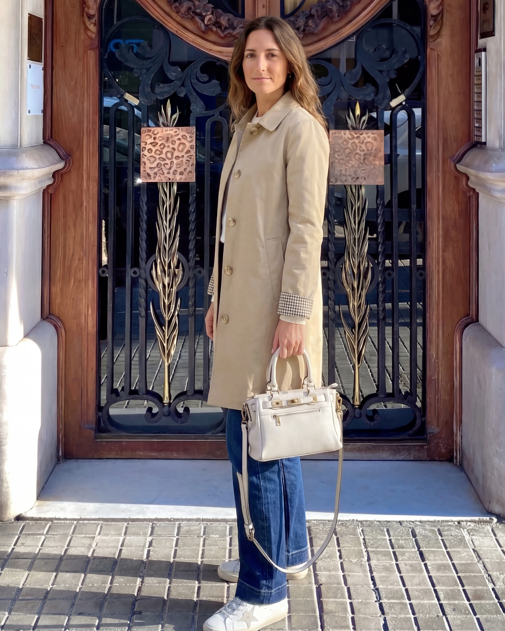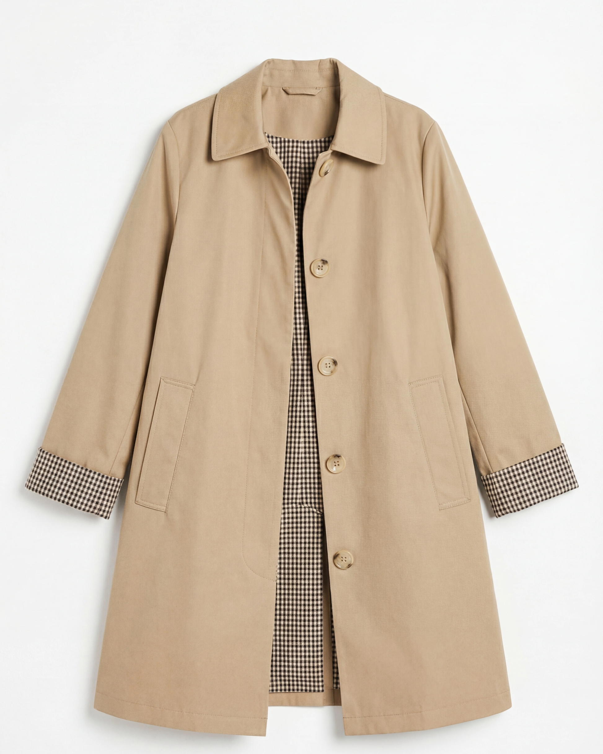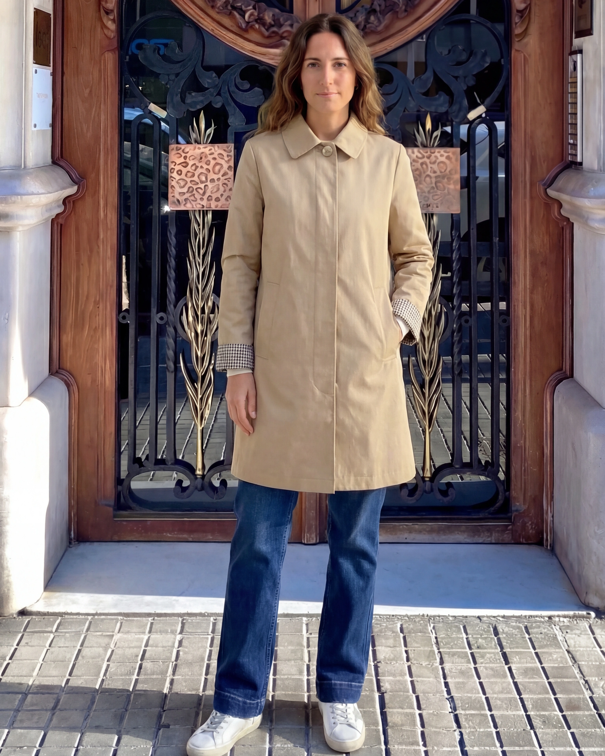 Gabardina recta de longitud media en un tono beige clásico, perfecta como fondo de armario. Tejido resistente pero ligero, con caída limpia y estructura sutil que no aporta volumen. Presenta cuello camisero, cierre frontal con botones visibles y tapeta lisa, además de puños vueltos con forro de cuadros que asoma unos centímetros para dar un toque especial.
